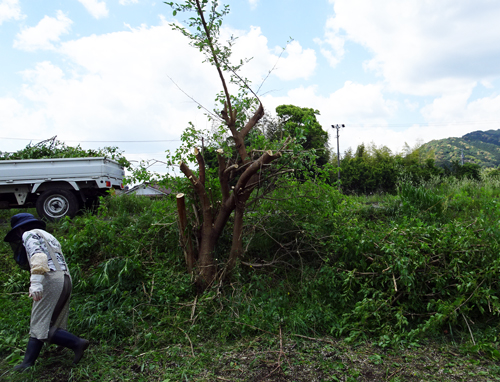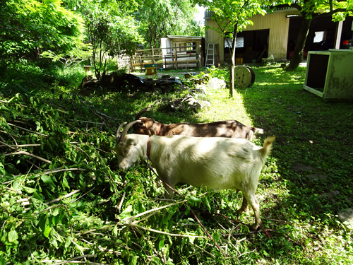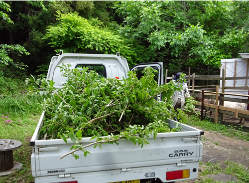 田の畔に生えた桑の木、桑の葉はヤギの大好物で。毎年葉を採りあたえています。樹の成長著しく、今年は、太い幹を残して、強剪定。軽トラで、何回も枝を運び、ヤギの食事に。経験で言うと、ヤギ 草大好き、もっと好きなのは 樹々の葉のようです。