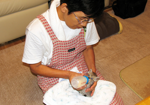 優しい職員達 皆でどうしようと相談し、結論は、館長引き取りし、お世話しつつ里親をさがすことに。家に来て、ミルクを飲み、お世話しつつ1週間。ご近所さんの音大生宅で飼ってくれることになりました。今は、ピアノ演奏を聴きながら、家ネコとなっています。ネコ種不明ですが、どうも ミックスではないようなネコ顔です。