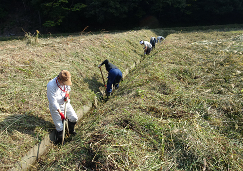 3イベントを紹介し、最後に ディープな草刈り紹介です。年2回 春と秋に、土地改良地区の水田を流れる河川敷の草刈りと、水路に堆積した土砂の排出です。