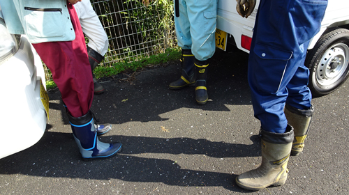 それぞれ自慢の長靴ファッションです。長靴は、皆 農家プロ仕様です。