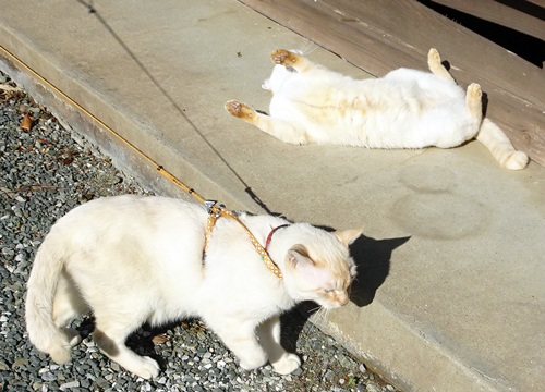 ただ、投薬治療 食事も治療食、外では他のネコとファイトするので、室内飼いです。元ノラは外大好きで、外へ出してと。ミヤ―ミヤ― 午前はリードを付けての散歩。ノッコもどこからか来て、二人で散歩です。