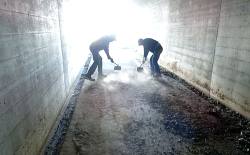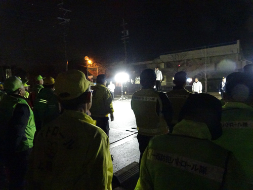 写真1 ウオーキング大会に備え、コース確認しつつ、軽トラ3台により、コース土砂、や道路堆積落ち葉 清掃。