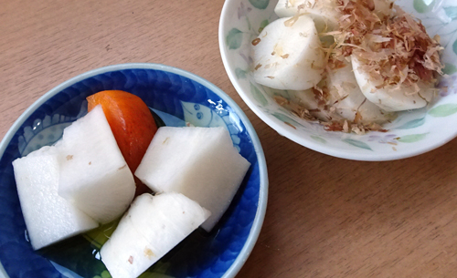 ダイコンは翌朝 オリーブオイルをかけてサラダで食べる パリパリそして甘い。葉は生き生きしている、菜飯で。カボチャは12月22日の冬至に風邪をひかないように食べてネ とメッセージです。