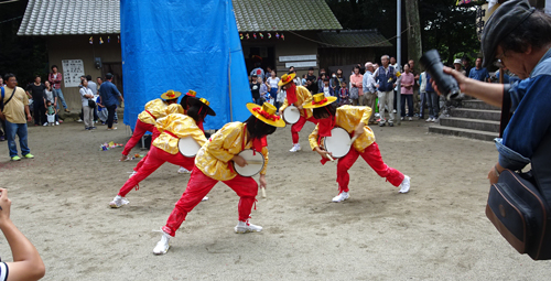 その前に、地域の小学生による、学習活動?の一環として、太鼓の披露 お母さん方 スマホやビデオ撮りでニコニコです。ギヤラリーの氏子さん 楽しく見守っています。