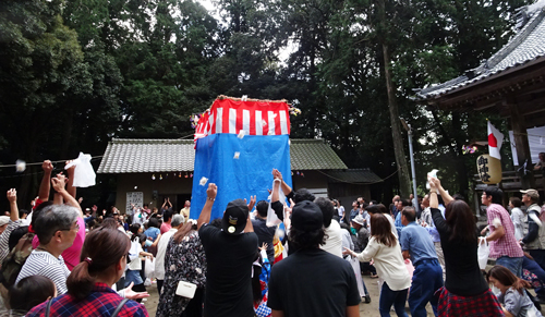 晴天の日曜日 町内の白鳥神社祭礼にご招待をうけ、赴きました。多くの氏子さんで境内は混雑していて、賑やかです。お楽しみは、景品有りの餅投げです。