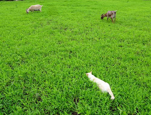 よくいわれるのは、ヤギが雑草を食べてくれていいネ。そのとおりですが、現実は、忙しい時に「ネコの手も借りたい」と同じレベルです。家ヤギは、外に出るの大好き 草も大好きですが、草の先をちょんちょんとつまみ食いする程度です。箱入り娘のお嬢様2人は、夏の陽ざしに弱く、長時間外にいると、息が荒くなってきます。