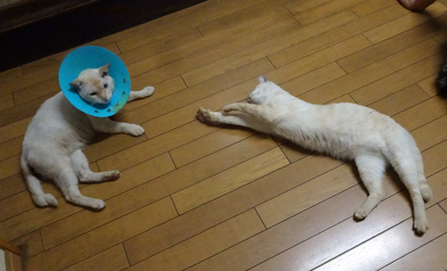 動物の生命力をあらためて 感じました。向かって右側 頭ケガの先輩トモ 向かって左側は足を噛まれたノッコです。