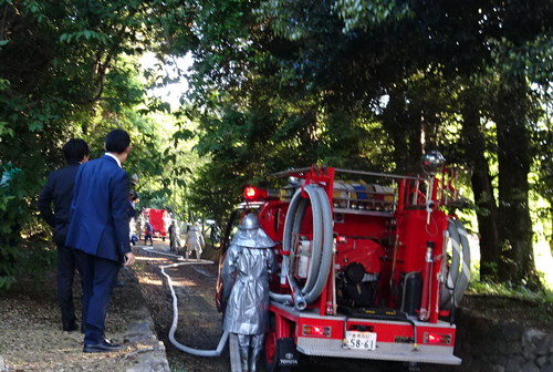 訓練は、由緒ある 大木町 進雄神社境内で火災発生。消防車により消火活動を実施しました。