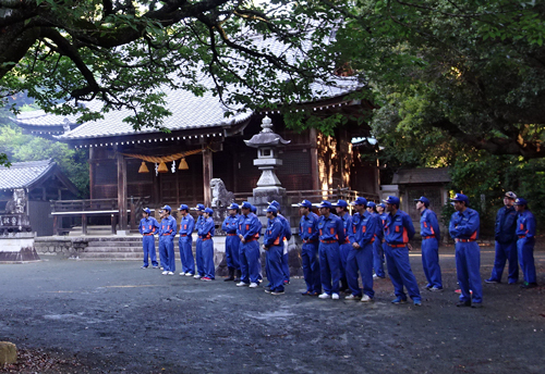 地域の消防団訓練に参加しました。午前6時訓練開始 場所は、地区内の伝統ある神社境内。参加団員100人ほど。
