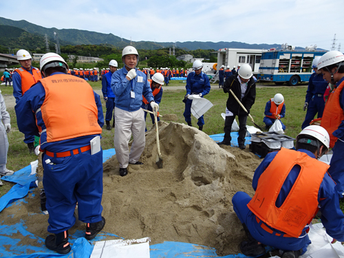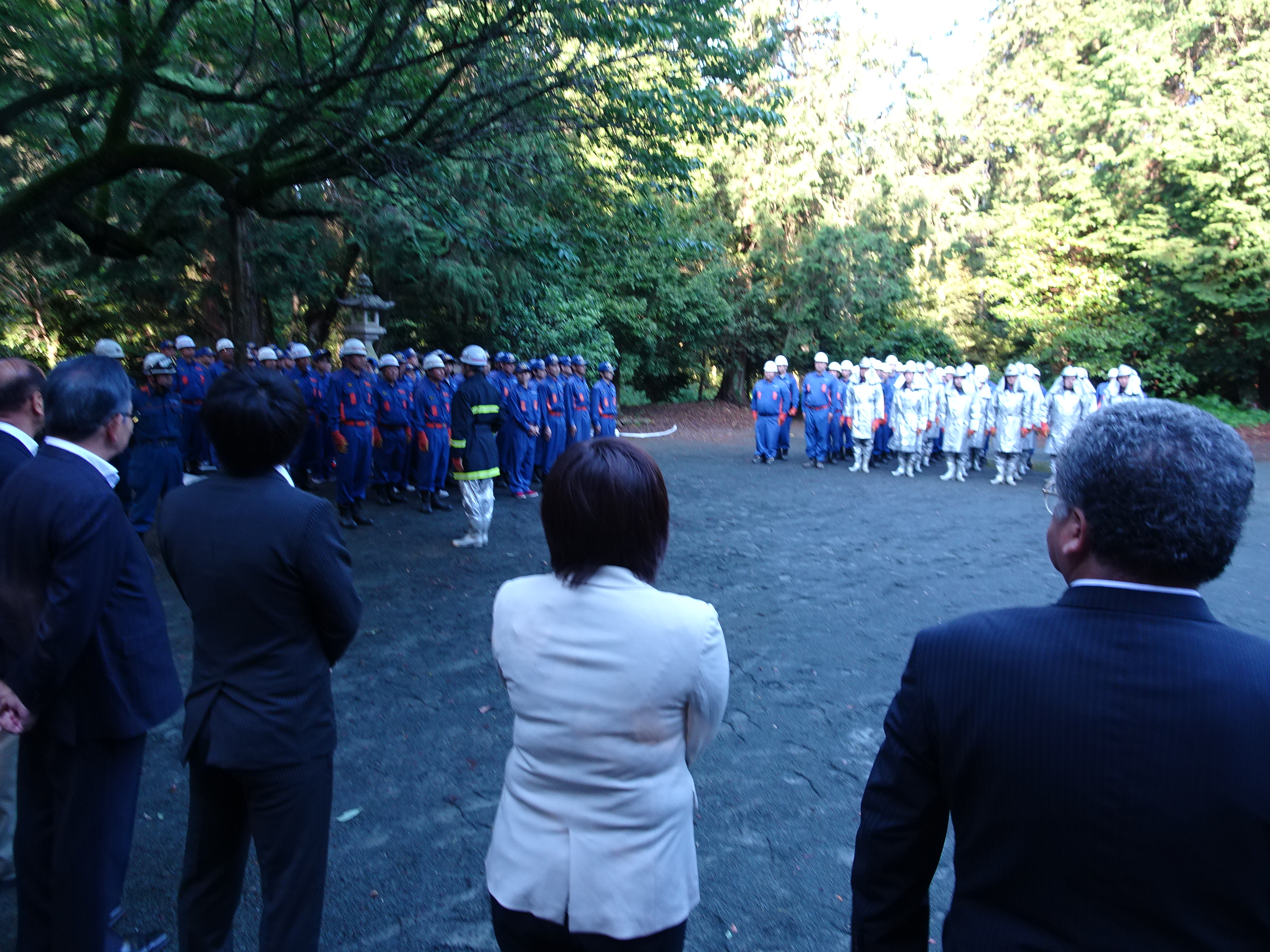 訓練後 消防署による訓練講評 来賓祝辞 に続き「火の用心三唱」で閉めます。火の用心三唱は、通常のばんざい三唱に代わる、消防独特の式辞です。この発声役を受けたまわりました。