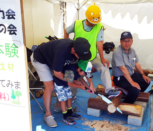 子どもや親子での丸太切り、ノコギリ体験初めての子ども達に、お父さん手伝ったり、お母さんは、スマホで写真を撮ったり、わきあいあいです。