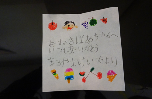 ひ孫の小1生 K太が前夜書いた おおばあちゃんへの棺へ入れる二人の秘密のお手紙を、K太にお願いして写真に撮りました。