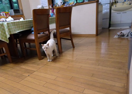 ノッコ 1年半前にやせ細った白いネコが、家に来て食事を与えていたらなつき、三食部屋付きの家ネコになり、毎日スリスリして、抱いています。
