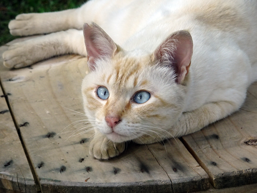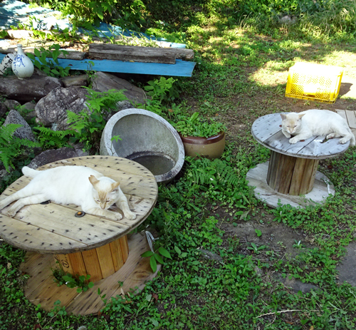 二人で鼻を突き合わせて 遠からず 近からずの距離となり,仲良しとなりました。先輩ネコのノッコは、電線ドラムでリラックス。トモは、後輩なので、遠慮かちに隣の、先代イヌのベッキーの墓石の上でのんびりしています。