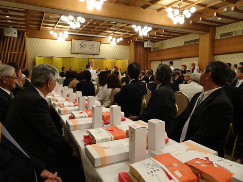例祭の後は、場所を移して、直会(なおらい)です。最初に流鏑馬騎乗少年3人への感謝状贈呈 設楽町の○○君騎乗4年と紹介されたら、皆 オーでした。