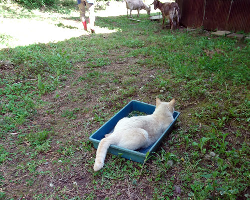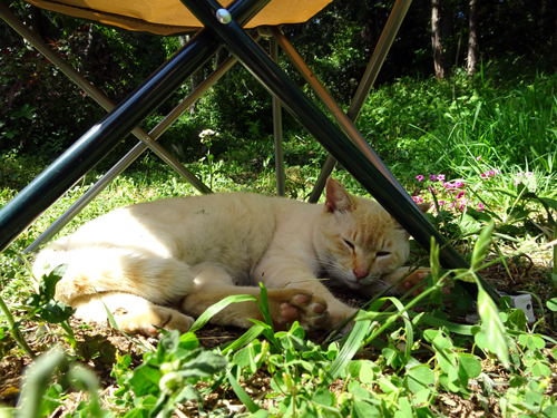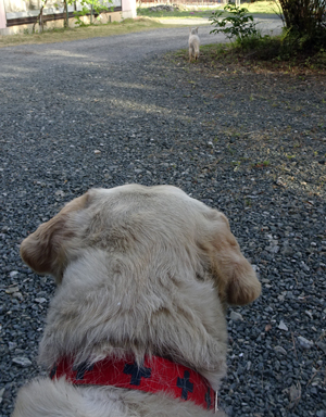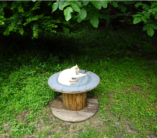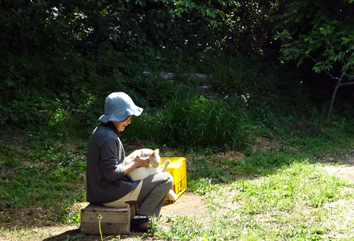 この季節早起きで、5時前に起床して、イヌに朝食を与え、ヤギ舎の開放、その頃になるとノッコがどこからか来て、ミャーと朝のあいさつ。スキンシップをしつつ新緑を眺める。静かな30分です。