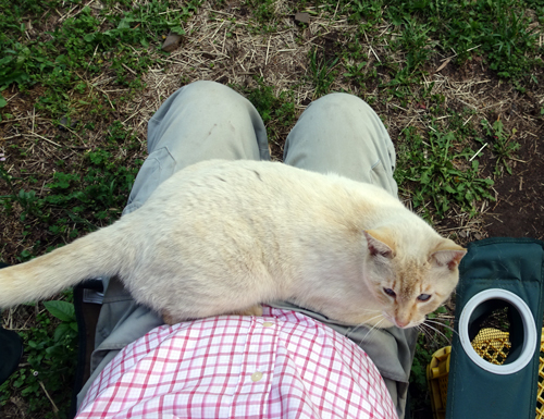 写真 抱きながらの右手でシャッター。ノッコは可愛いが、抱いているピンクシャツの風体が美しくない。お腹を引っ込ましてもこの程度。遠近法でいえば、近くの物は大きく、遠くのものは小さくと自分で納得しています。膨張色のシャツを着たのがイカンと反省です。