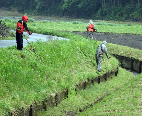 朝 雨降りやまず。8時の集合時間には、15人程 皆 長靴、かっぱ着用で草刈支度です。夜業意欲まんまんです。班長のけがのないようにの指示のもと作業です。農家に生まれたサラリーマンたち、心得ていて、安全確保しながら作業終了で、草刈りプロフェッショナルです。子どもの頃からのおさな馴染み達は、互いに協力しあいながらの作業です。