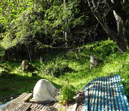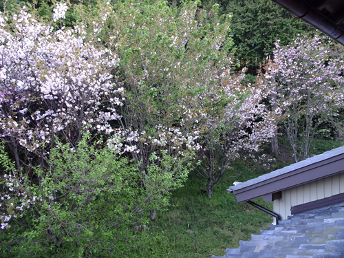 サクラ満開 ノッコ 圧倒的なジャンプ力でヤギ舎の上に、花見&昼寝でご機嫌です。