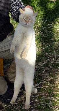 1年程前の冬 痩せたネコが家周りでミャーとなき、台所前でたたずみ、エサをあげると、翌日も来る。可愛い瞳でこちらを見つめる。こちらがメロメロ。その後 避妊手術をし家ネコ状態。三食食べ、ネコベッドで寝て、昼間は室内で日向ぼっこ。ヤギや家族といつも一緒にいたいと、呼べばどこからかとんでくる。時には一緒に歩くようになりました。