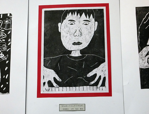 Y太作品は、版画でピアノを弾く子ども。自画像作品か。手の一部が、絵からはみ出ているのが良い。