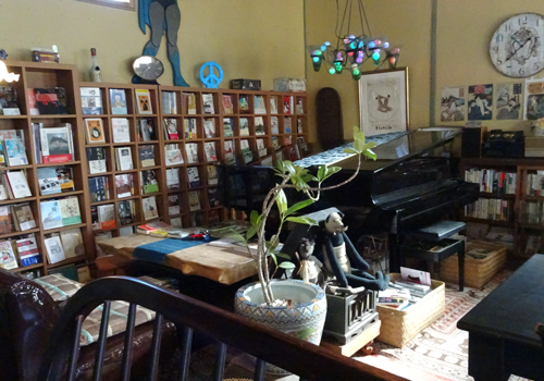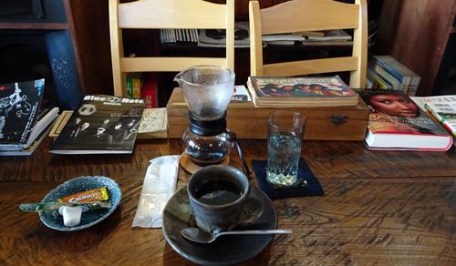 書架の本は、販売品ではなく愛読書で、珈琲を飲みながら読んでくださいとのこと。芸術関係の書籍多し。