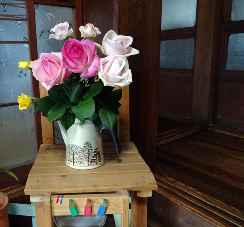玄関にはバラの花が。冬に咲くバラを、冬薔薇と書いて、ふゆそうびと読む。季節を感じられます。