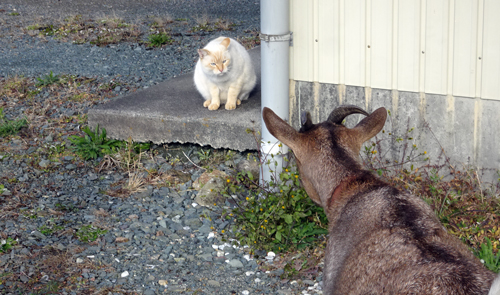 ノッコ 家周りがにぎやかな時 顔を出し 私もいますヨ ミャーとアピール。ヤギの外食中に現れ、見ています。なんだなんだとヤギがちかづく。ノッコが慌てて、車の下へ。狭いところは。小さなノッコのシェルターです。そこに入れば安心で、ドヤ顔です。そして、また ノコノコ近づいてきます。一緒に居たいんだと感じます。