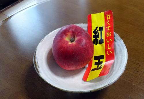 お店の店頭には、多くのリンゴが並んでいます。紅玉を見つけて即 買いました。あまり見かけない品種ですが好きです。果皮は紅い小玉で、酸味が強く、甘みはあまりありません。アップルパイなどの材料として、果肉がしっかりしていて、甘くないのが適しているといわれています。