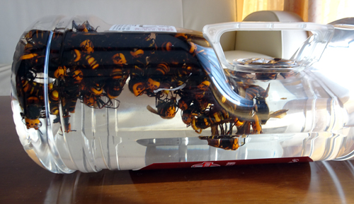 捕獲して、焼酎漬けになったスズメバチ写真です。アシナガバチと比較して胴体が太くそして、大きいです。