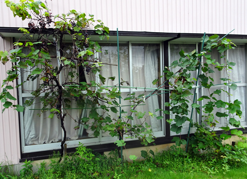 庭のブドウの樹 今年は実りが悪いです。無農薬 無肥料でもたくさんの房を着けていたのですが、来年に期待です。品種は、マスカットベリーA 黒い果皮で糖度の高いブドウで、巨峰のミニみたいなブドウです。毎日摘まんで、皮のままほおばり楽しんでいます。
