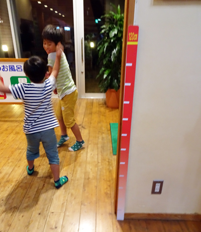 今回 保育園児のK太が男湯デビューです。今までは、おばあちゃんと一緒に女湯に入っていたのですが、成長してきたので今後は、男湯です。公衆浴場では、男の子はが女湯に入る またはその逆は 風呂の規則で年齢6歳までなどと定められているところもあるようですが、本宮の湯は身長で、120cm が目安です。受付の横に身長目盛りがあり、K太はまだまだ120cmに達してはいませんが。お風呂に入る前から2人 ハイテンションです。