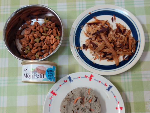 主食は、ペレット状フード。大好物は、缶詰フード。副食の、カツオブシと、イワシ玉はスーパーサンヨネ特選です。魚肉ソーセージはあまり好きではないよう。グルメネコとなりつつあります。でも、外では昆虫を採って、遊びつつ食べているので、栄養バランスはよさそうです。