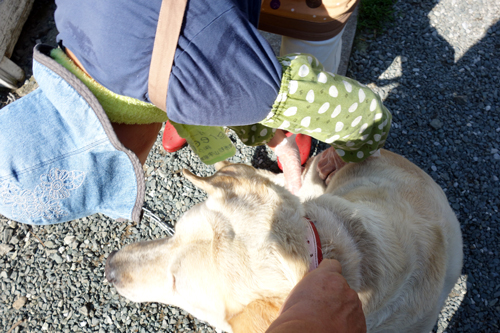 急いで、かかりつけ獣医さんへ。一目患部を見て、急性湿疹ですネと診断。この時期に出現するペットの皮膚病で、毛に覆われているゴールデンやラブに多く見られます。患部周辺の毛を刈り、軟膏塗布と注射。内服薬と軟膏を処方され3日後に再診です。