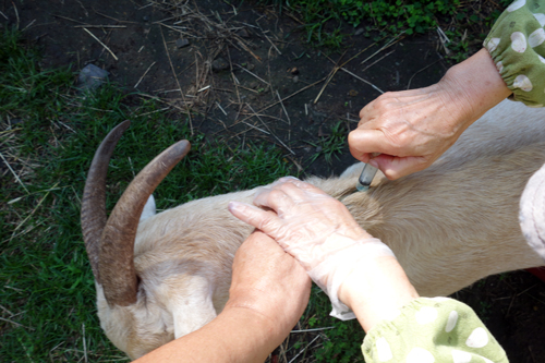 ヤギのメイたち その光景を柵越しに見つめています。同じ日、月一回の、ヤギの要麻痺(ようまひ 蚊が媒介するヤギの病気)の薬を接種。背中の皮膚に注射器で薬を垂らします。少し逃げてから、接種されるのがお約束です。