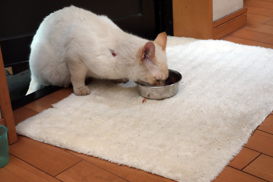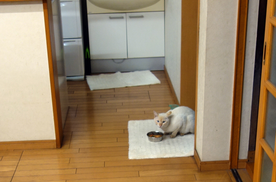 食事は、朝 昼 夕は食べにくる。でも敏感、慎重で、音や気配を感じると即反応し退却し即もどってくる。でも、手の上に置いたペットフードやソーセージは食べるようになった。