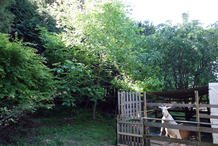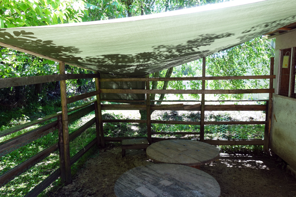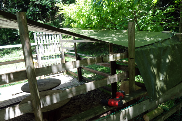 ヤギ舎の遮光シートは、強い日差しを弱めてくれるし、周囲の環境にも溶け込み自画自賛でしたが、問題は雨でした。遮光とともに雨よけも目的。大量の雨が降るとシートは全ての雨を受けて、シート真ん中はミニプール状態です。