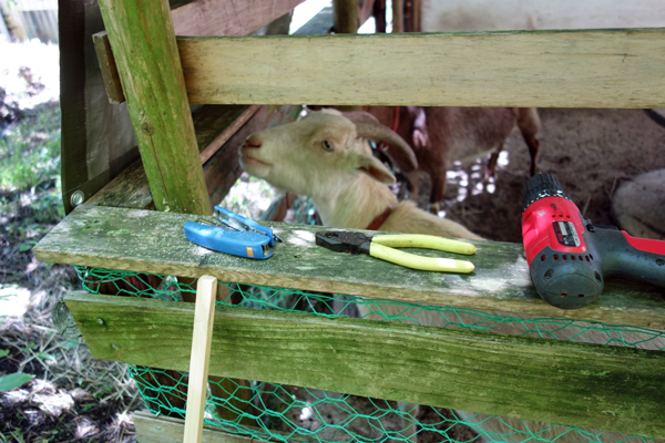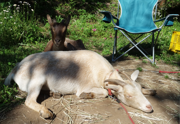 シートを追加して、ヤギ舎外へ水が流れるように工夫。作業中2人は寄って来て なんだなんだ と協力のようだが邪魔をする。でも、自分たちにいい事をしてくれているとは感じているようです。後は、雨が降ったらどうなるかです。作業後は皆で達成感に浸りながら昼寝です。