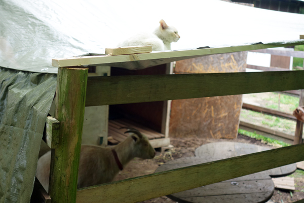 シートに傾斜をつけて、雨を流す。結果水は全てそこから下に落ちるが、流出先は、ヤギ舎内なので、そこが水たまりとなる。