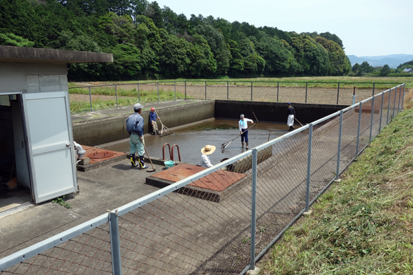 土曜日は晴天 午前中は、土地改良地区田周辺の堤防草刈り。午後は、豊川総合用水から地域水田に水を供給するファンポンドの貯水池の水抜き清掃と、水を引き込む川の大量の堆積土砂の除去作業です。総勢20人余 草刈2時間 土砂除去が3時間 腰にダメージをうけ結構つらい。でも、作業しながら、たわいもない話しをしながら、和気あいあい。作業中には川にマムシが泳いでいたりと話題満載です。服装は、長靴、長そでシャツがお約束。作業終了後の達成感は疲れていても清々しい。