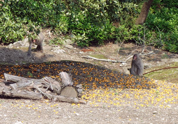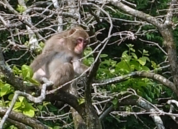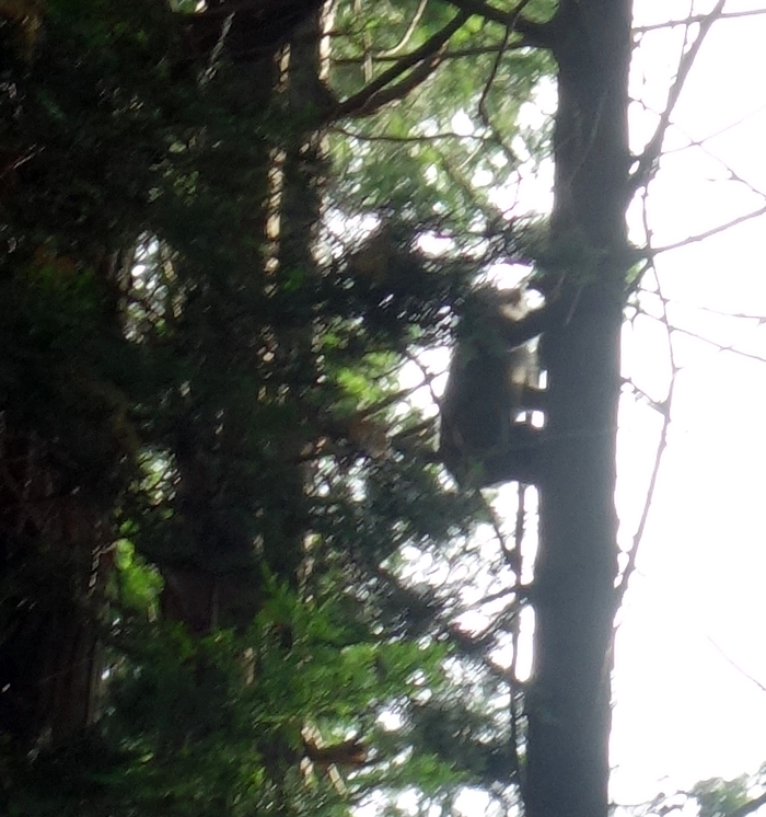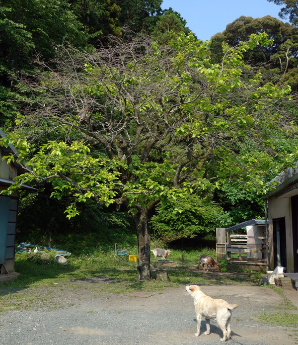 早速見に行くと、ヤギ舎隣接の里山のヒノキの木々が揺れている。サルが7~8頭木を飛び交っている。食べるものは無いので、偵察か? 散歩か? 分らないが、今年初めての訪問。また来たかとがっかり。