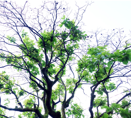 新芽が出始めてから1ヶ月ほどたち、太い幹から新たに新芽が続々と発芽。今は、樹全体が緑に覆われています。木も危機感をもったようで、幹から芽を出しました。生命力の強さを感じました。