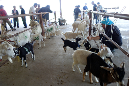種の育成保存を目的とした子山羊品評会に続いて、山羊の競り市となります。あつこさんを始め、家に新たなヤギを迎えようと、競り市参加のY母さん、Sさんや、ヤギオフ会メンバーさんも。互いに、ヤギさんを見てワイワイガヤ。