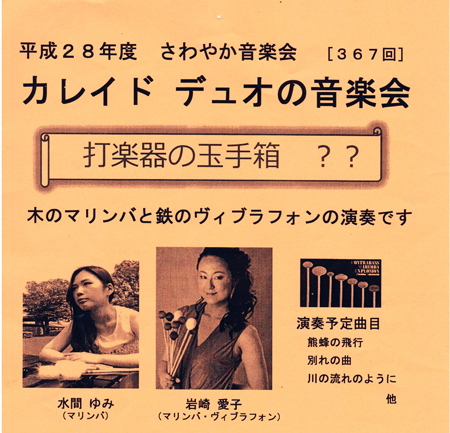 6月9日 豊川市小坂井 フロイデンホールで、第367回さわやか音楽会 カレイド デュオの音楽会 が開催されました。私も実行委員会スタップとして参加しました。水間由美さんのマリンバと、岩崎愛子さんのマリンバ・バイブラフォン演奏です。県立芸大と、東京音大で研鑽を積んだ、新進気鋭の演奏者です。