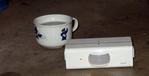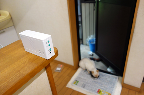 そこで、Kホームセンターで、センサーを購入しました。多くあるのは、防犯目的の、侵入者を探知して、光の点滅や大きな音での警告ですが、これでは、ウエルカムネコには逆効果です。目的ピッタリのグッズ購入。ELPAのワイヤレスチャイムで、配線不要です。室外にセンサー送信機を置き、反応すると室内の受信機がピンポンとなり、知らせる。今は、ピンポン音が鳴ったらドアを開けます。電波は50mまで反応し室内どこでもOKです。なかなかの優れものです。でも、家に居ない時は出れませんが。