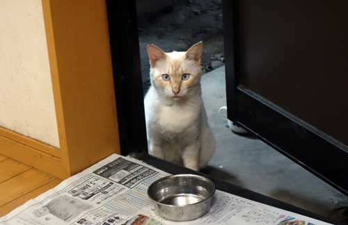 翌朝に勝手口で、ご飯ちょうだいとミャーミャーです。今は、朝 昼 夜3回来ては食事。その後は自由時間。家周辺でのんびりしています。変わったことといえば、来院以来 まだ身体に触らせてはくれませんが、距離が縮まり、接近してもお構いなしです。イヌもヤギも互いにお構いなしです。ノッコも居場所を見つけたことと、皆への甘えを感じます。