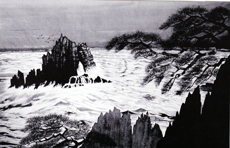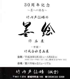 作家は、1930年新城市生まれ在住。水墨画 竹風会を主宰 多くの個展開催 国内、国外の賞を受賞しています。ミュージアムで最大規模の第一展示室での30周年記念個展です。水墨画は技術が必要で、多くの人が書道経験者と言われています。墨の濃淡、画面構成 迷いのない線を堪能しました。竹内さんは大先輩であり、長年の知人です。私のイラスト展にも訪れてくれていて、絵のジャンルは異なりますが、多分作画の異なる、イラストを受け入れていることが感じられます。85歳現役 お元気です。