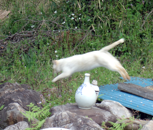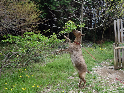 ノッコに出会ったのは昨年秋 その後ご近所を歩いているのを時折見かけました。その後自宅訪問 我が家の人もペットも排除せず、ヤギ達も変なのが来たと興味深げ。イヌの、はなも外から来た人は吠えるが、主人の知人?だと吠えない。