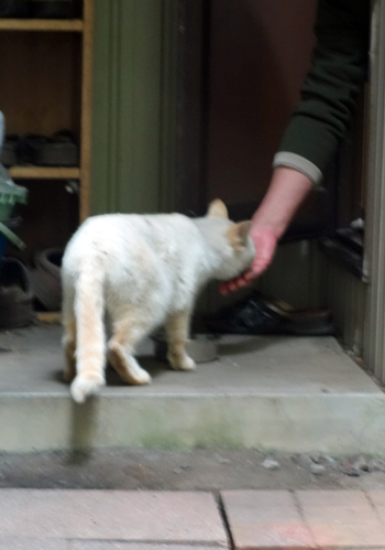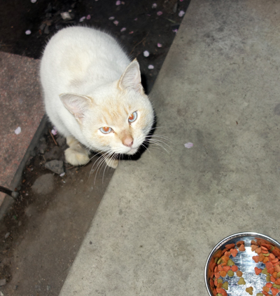 夕方 勝手口に立っていて、ペットフードを美味しそうに食べました。