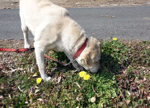 はなと散歩。写真は、タンポポの匂いを嗅いでいるようですが、本当は、他のイヌの匂いを嗅いでいるのです。